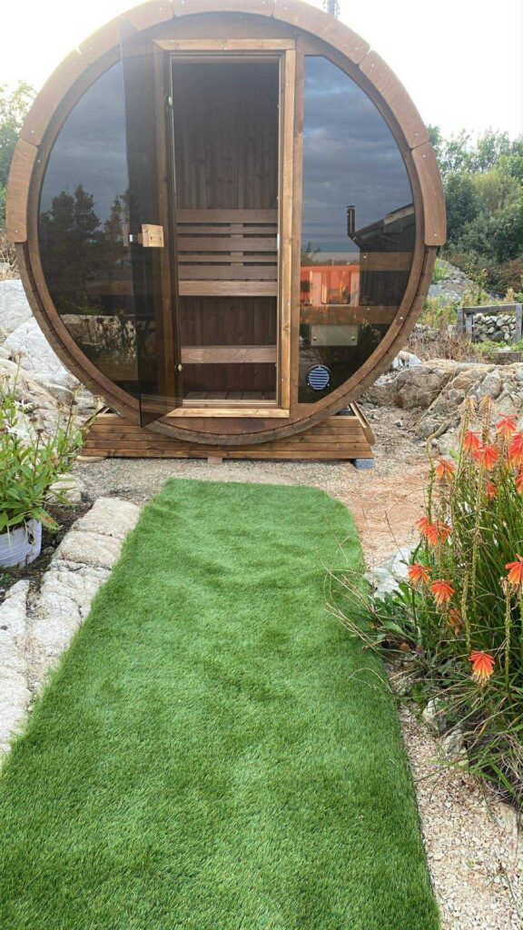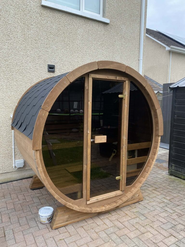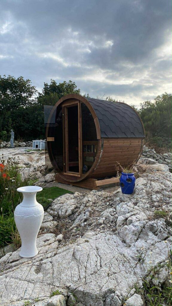 Terrace sauna 160 Measurements: Ø 205 cm x 160 cmCapacity: 2-4 peopleHeater: electrical Harvia BC60 6,0 KWOutside wall: 42 mmInside wall: 28 mmMaterial: ThermowoodSauna benchFloor grate8mm toughened bronze glass doorRoofing material used is bitumen shingles Blackalso available with glass front wall 3850 € Assembly and shipping in Ireland is not included. Contact us Contact us